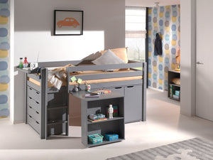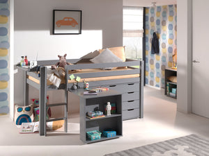 PINO-combinatie: een grijze PINO hoogslaper, een PINO bureau, een PINO kommode met 4 laden, een PINO hangtablet en een PINO kommode met 2 deuren