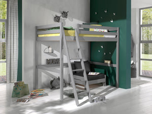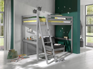 PINO-combinatie: een grijze PINO mezzanine, een PINO kommode met 2 deuren en een PINO zetelbed