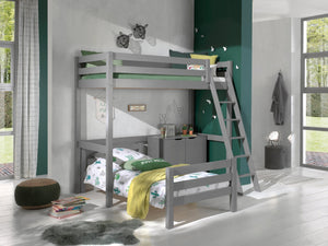 PINO-combinatie: een grijze PINO mezzanine, een PINO enkel bed en een PINO kommode met 2 deuren