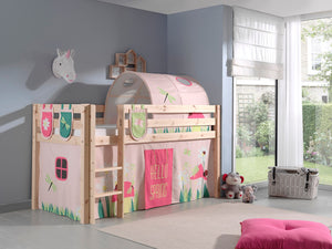 PINO-combinatie: een natuurkleurige PINO hoogslaper , een speelgordijn princess, 3 zakjes princess en een tunnel princess