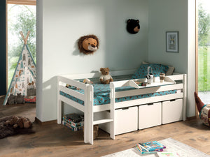 PINO-combinatie: een witte PINO halfhoogslaper met ladder, een PINO set van 3 laden en een PINO hangtablet