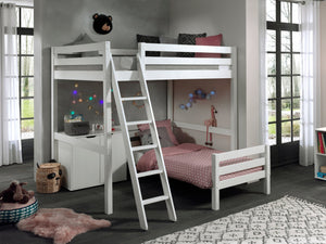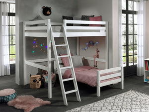 PINO-combinatie: een witte PINO mezzanine, een wit PINO enkel bed 90x200cm en een PINO boekenkast